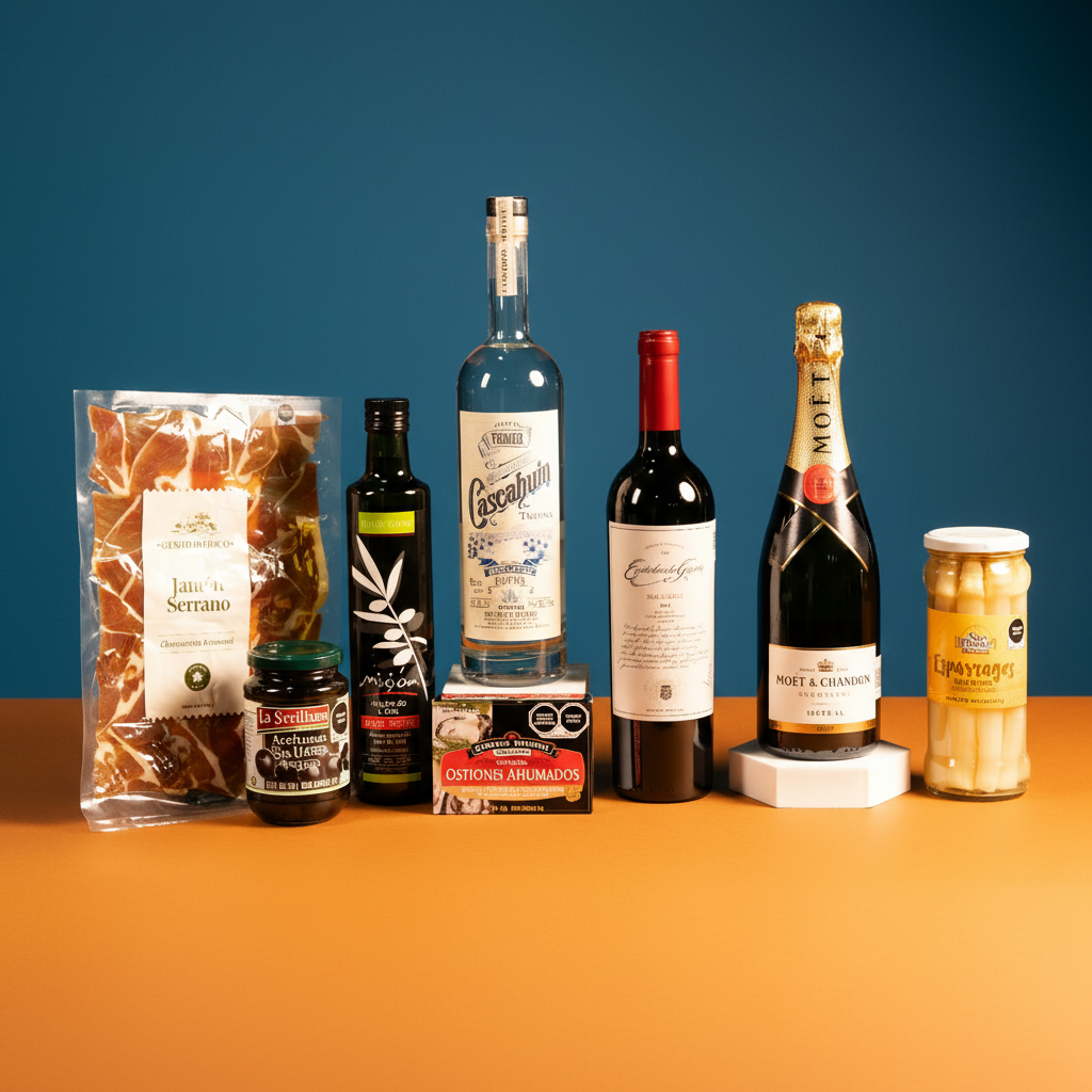Contiene: • Champagne Moet Chandon Brut Imperial 750ml • Vino Tinto Escorihuela Gascón Malbec 750ml • Tequila Cascahuin Blanco Tahona 750ml • Aceite de Oliva Sto. Tomás Extravirgen 500ml • Espárragos Blancos San Miguel 530 gramos • Aceituna Negra Sin Hueso Sevillana 350 gramos • Ostiones Ahumados Crown Prince 106 gramos • Jamón Serrano 70 gramos • Arreglo Chico • Caja de madera chica