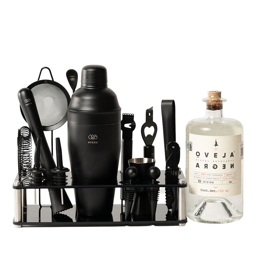Contiene: • Mezcal Oveja Negra 750ml • Juego de Bar • Tabla chica de madera • Arreglo Chico