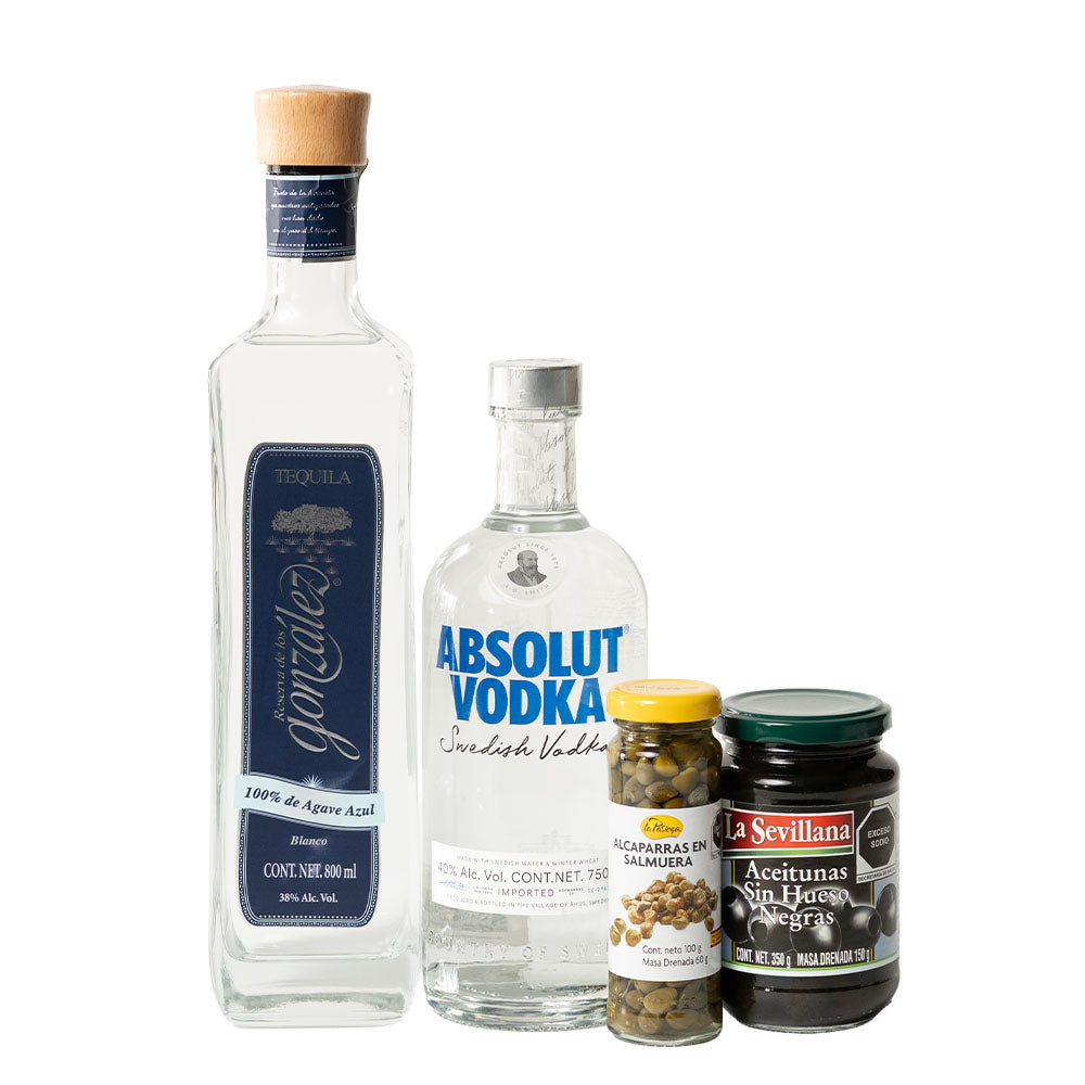 Contiene: • Vodka Absolut Blue 750ml • Tequila Reserva de los gramosonzález Blanco 800ml • Alcaparras La Pasiega 100 gramos • Aceituna Negra Sin Hueso Sevillana botella 350 gramos • Arreglo Miniatura • Charola con Ranura mini