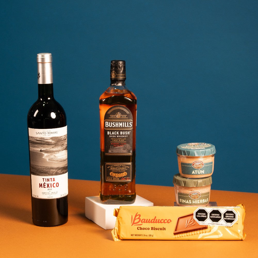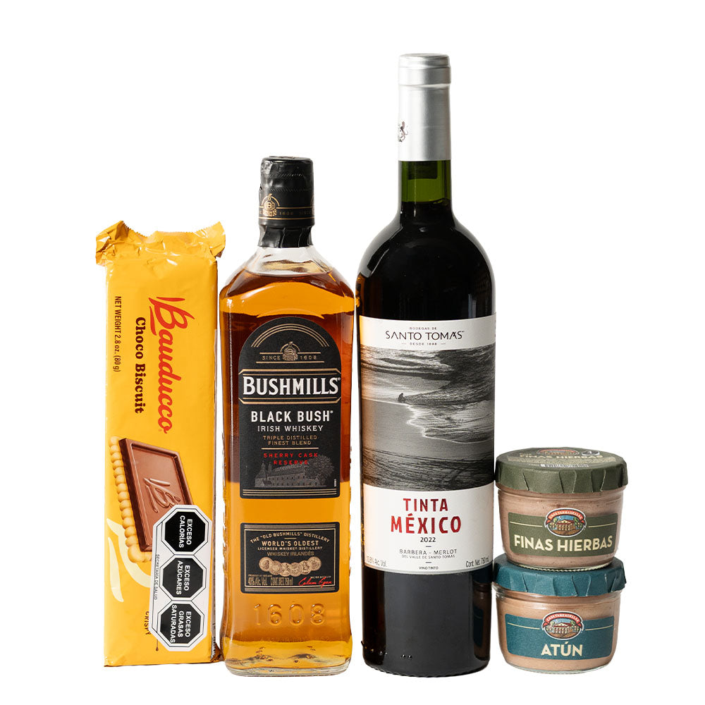 Contiene: • Whisky Black Bushmills 750ml • Vino Tinto Santo Tomas Tinta México 750ml • gramosalletas Choco Biscuit 80 gramos • Paté de Atún Tarradellas 125 gramos • Paté de Finas Hierbas Tarradellas 125 gramos • Charola con ranura mini • Arreglo Miniatura