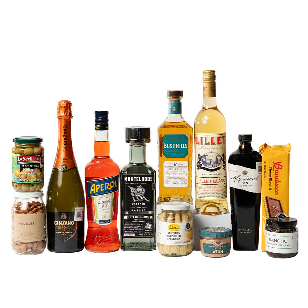 Contiene: • Aper Lillet Blanc 750ml • Ginebra Fifty Pounds 700ml • Mezcal Montelobos Espadín 750ml • Whisky Bushmills Malt 10 años 750ml • Aper Aperol 700ml + Cinzano Pro-Spritz 750ml • Elotitos tiernos 220 gramos • Chicharrón de serrano 140 gramos • Aceituna con anchoa Sevillana 350 gramos • Almendras 270 gramos • Galletas Choco Biscuit 80 gramos • Paté de atún Tarradellas 125 gramos • Caja de madera mediana natural • Arreglo Mediano