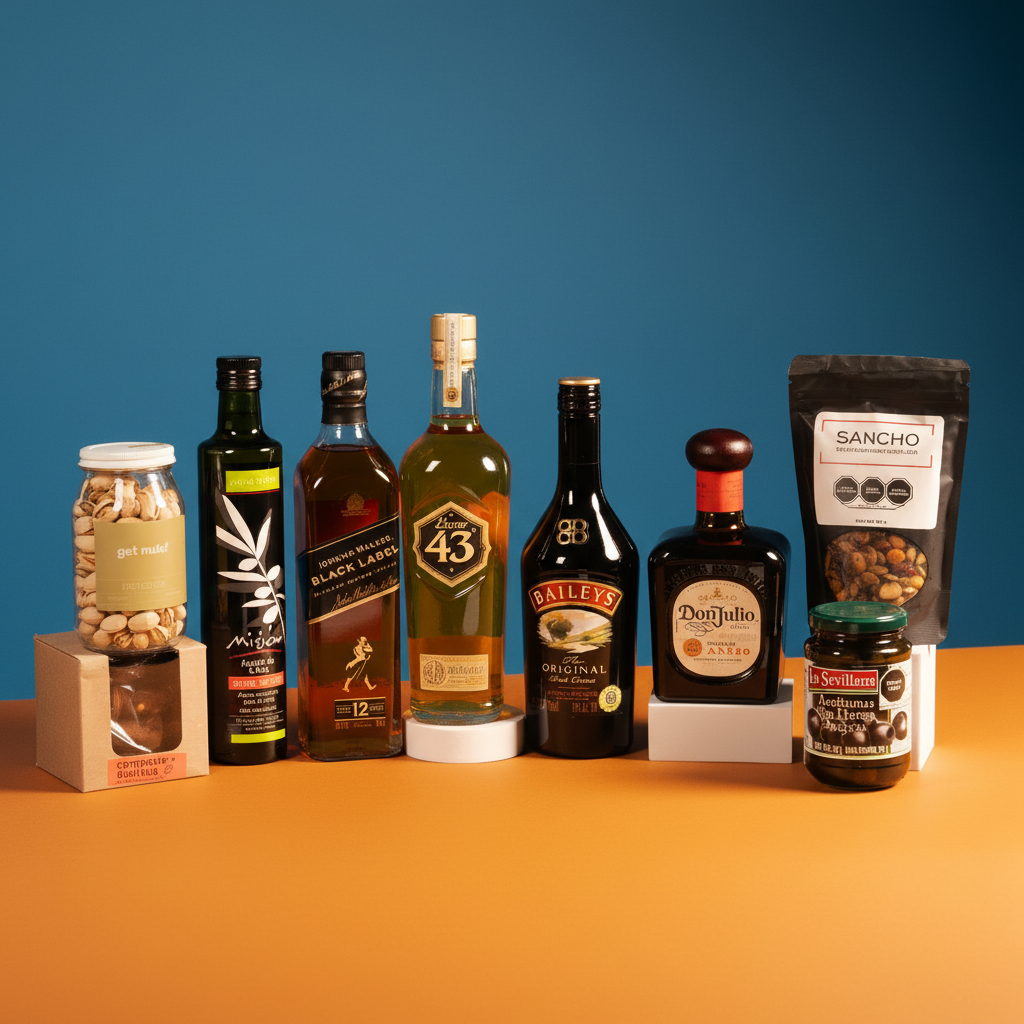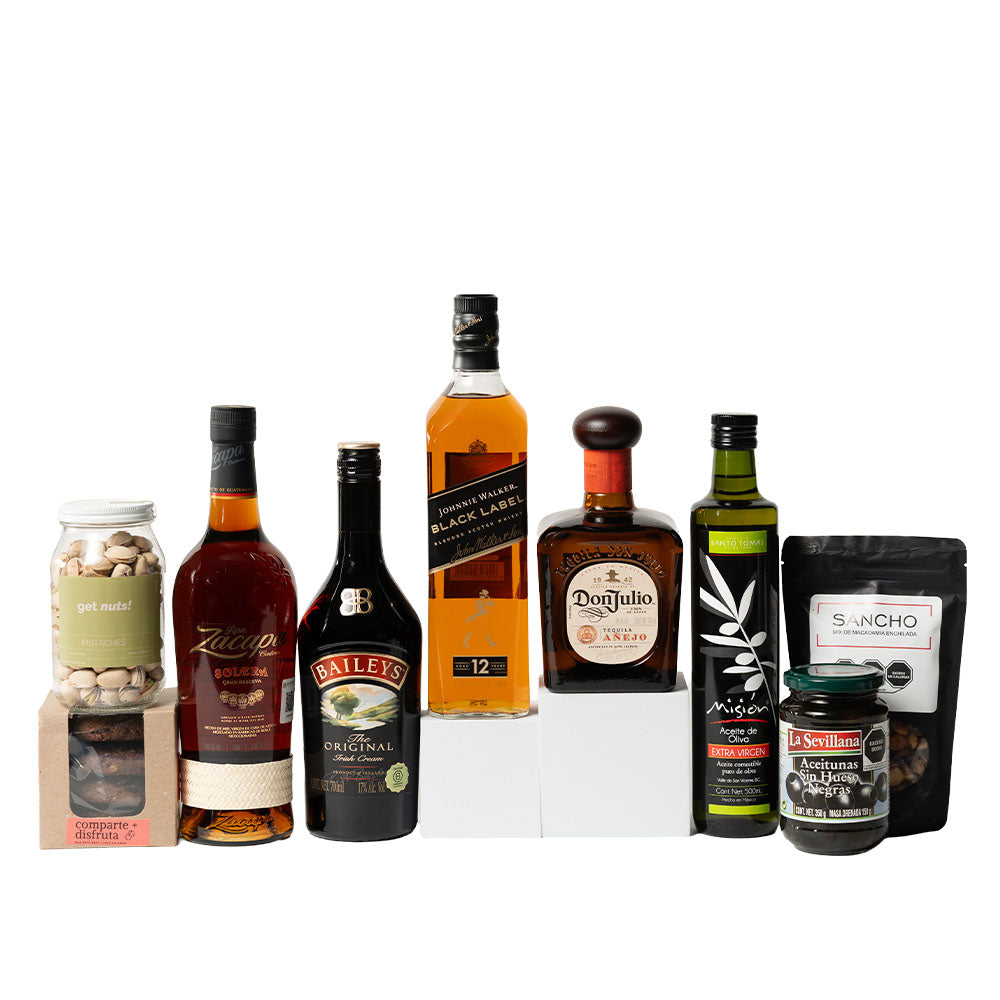 Contiene: • Crema Baileys Irish Cream 700ml • Ron Zacapa Centenario 23 años 750ml • Tequila Don Julio Añejo 700ml • Whisky Johnnie Walker Etiqueta Negra 750ml • Aceituna negra sin hueso Sevillana 350 gramos • Galletas de cocoa con chispas de chocolate semi amargo y tropiezos de sal • Aceite de oliva Sto. Tomás extravirgen 500ml • Pistache 200 gramos • Mix de macadamia enchilada Sancho 250 gramos • Caja de madera chica • Arreglo Chico