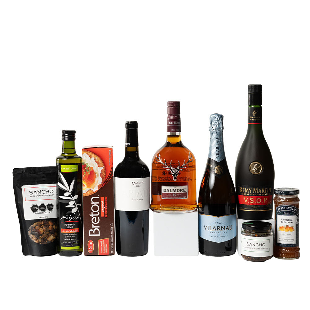 Contiene: • Cognac Remy Martin VSOP 700ml • Whisky The Dalmore 12 años 700ml • Vino espumoso Cava Vilarnau Brut 750ml • Vino tinto Mariatinto 750ml • Galletas Breton 200 gramos • Mermelada de durazno St. Dalfour 284 gramos • Salsa Samacha Sancho 280 gramos • Mix de macadamia enchilada Sancho 250 gramos • Aceite de oliva Sto. Tomás extravirgen 500ml • Caja de madera mediana natural • Arreglo mediano