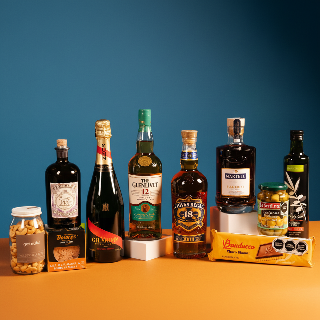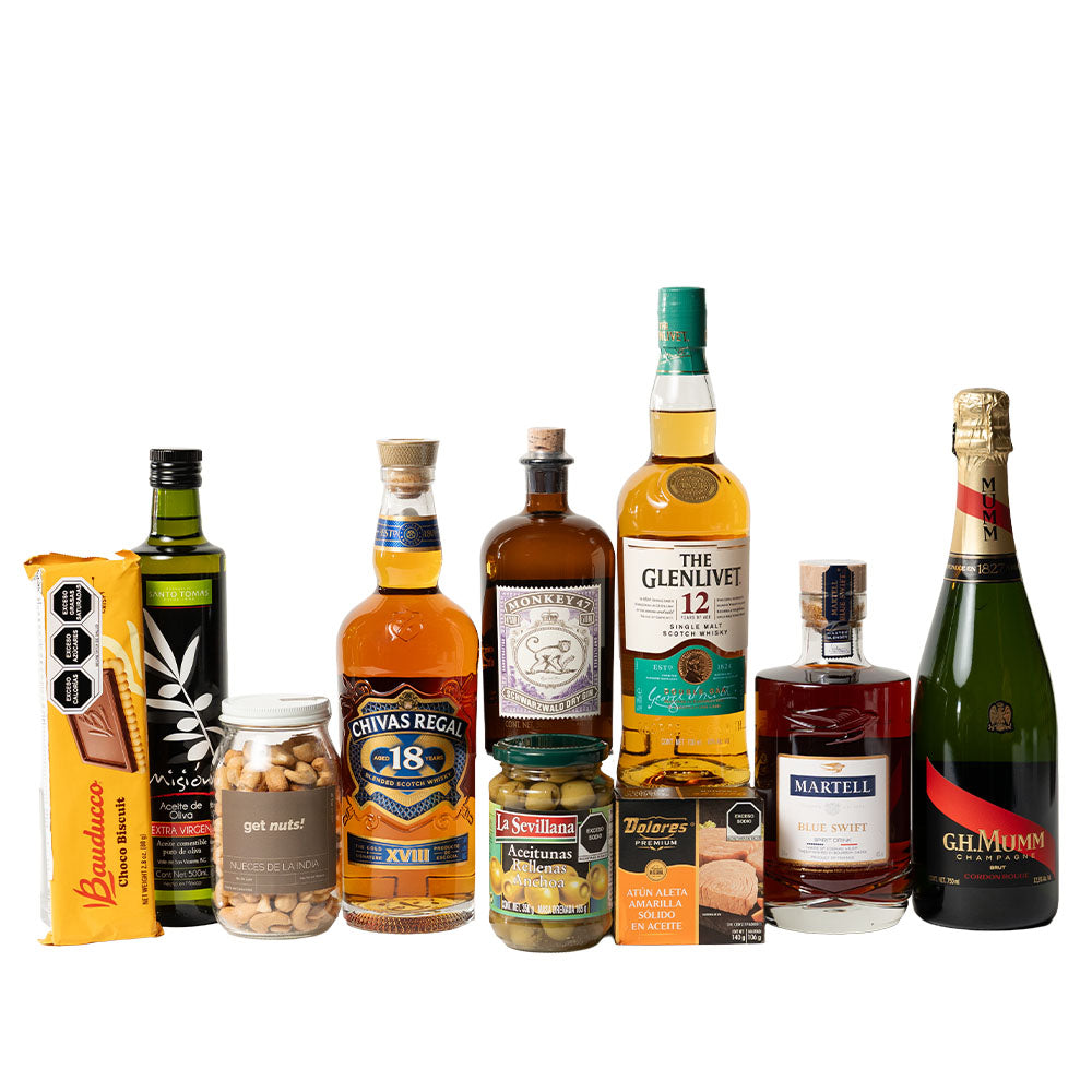 Contiene: • Whisky The Glenlivet 12 años 700ml • Ginebra Monkey 47 500ml • Champagne G.H. Mumm Brut Cordon Rouge 750ml • Whisky Chivas Regal 18 años 750ml • Cognac Martell Blue Swift 700ml • Aceite de oliva Sto. Tomás extravirgen 500ml • Atún Dolores Premium en aceite de olivo 140 gramos • Galletas Choco Biscuit 80 gramos • Aceituna con anchoa Sevillana 350 gramos • Nuez de la India 250 gramos • Caja de madera mediana natural • Arreglo mediano