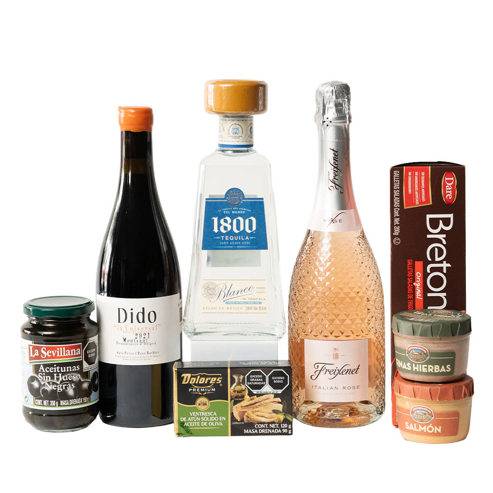 Contiene: • Vino Tinto Dido La Universal 750ml • Vino Espumoso Italian Rose 750ml • Tequila Cuervo 1800 Blanco 750ml • Atún Dolores Premium Ventresca 120 gramos • Aceituna Negra Sin Hueso Sevillana 350 gramos • Paté de Finas Hierbas Tarradellas 125 gramos • Paté de Salmón Tarradellas 125 gramos • gramosalletas Bretón 200 gramos • Caja de madera chica • Arreglo Chico