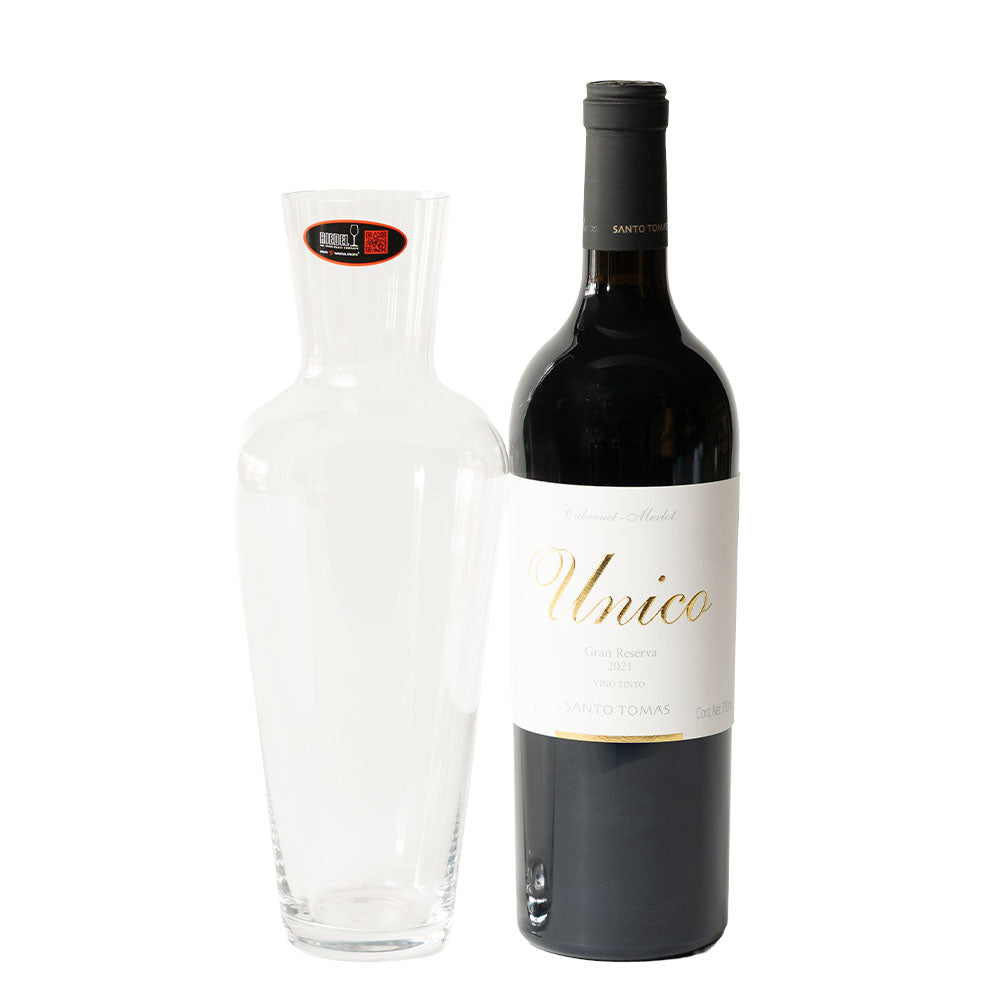 Contiene: • Vino Tinto Unico Santo Tomas 750ml • Decantador Wine Friendly Riedel • Arreglo Chico