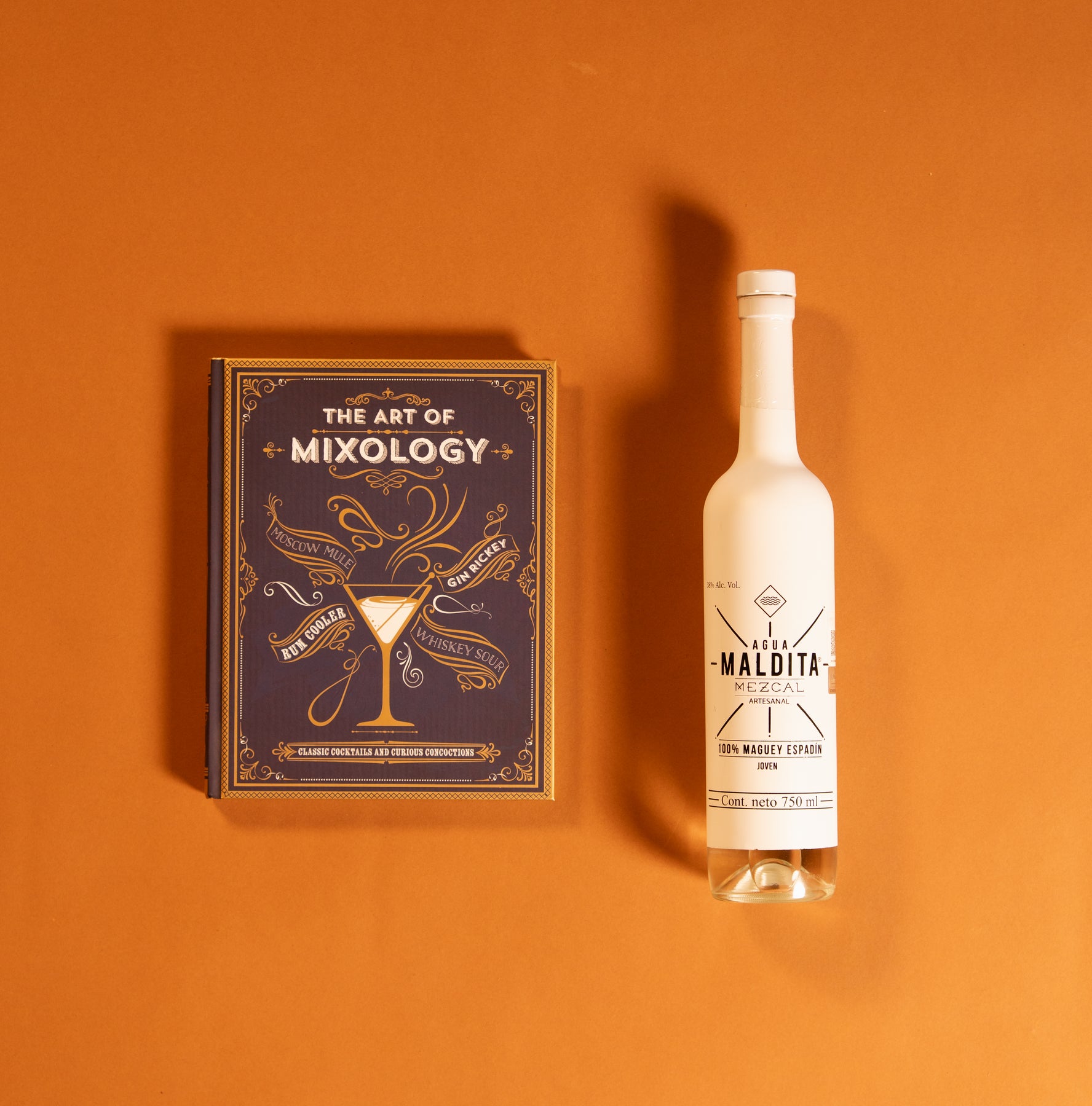 Contiene: • Mezcal Agua Maldita Blanco 750ml • Libro de Mixología • Tabla chica de madera • Arreglo Mediano
