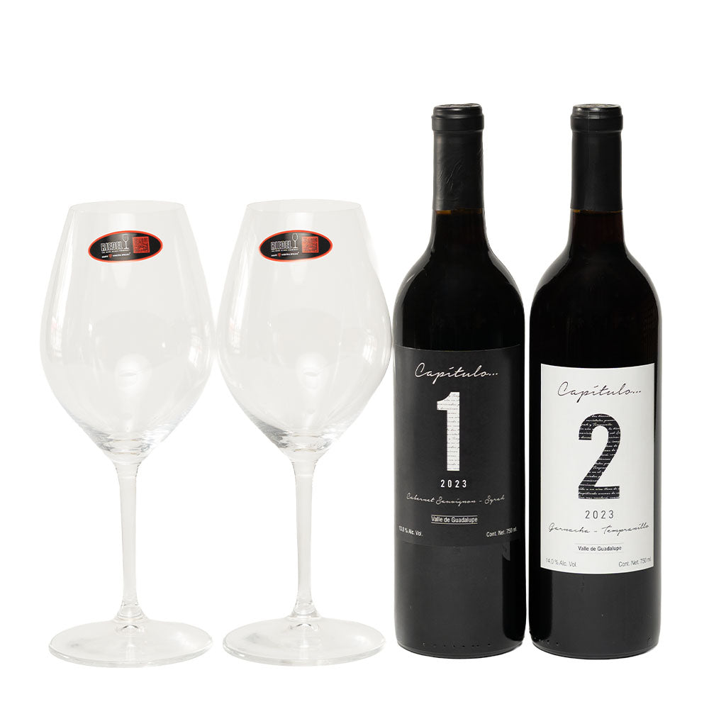 Contiene: • Vino Tinto Capítulo I 750ml • Vino Tinto Capítulo II 750ml • Copa Riedel Modelo.002 Ouverture • Copa Riedel Modelo.002 Ouverture • Arreglo Chico