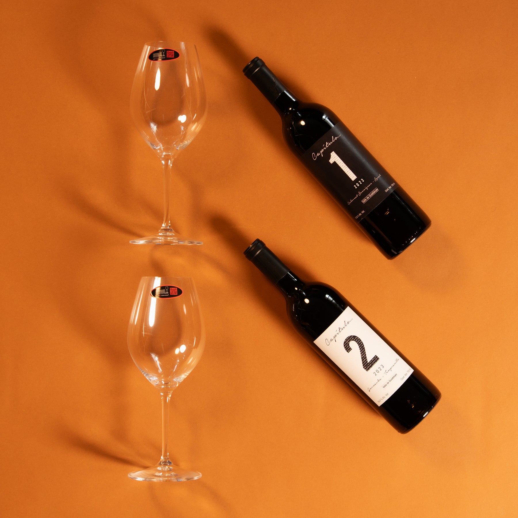 Contiene: • Vino Tinto Capítulo I 750ml • Vino Tinto Capítulo II 750ml • Copa Riedel Modelo.002 Ouverture • Copa Riedel Modelo.002 Ouverture • Arreglo Chico